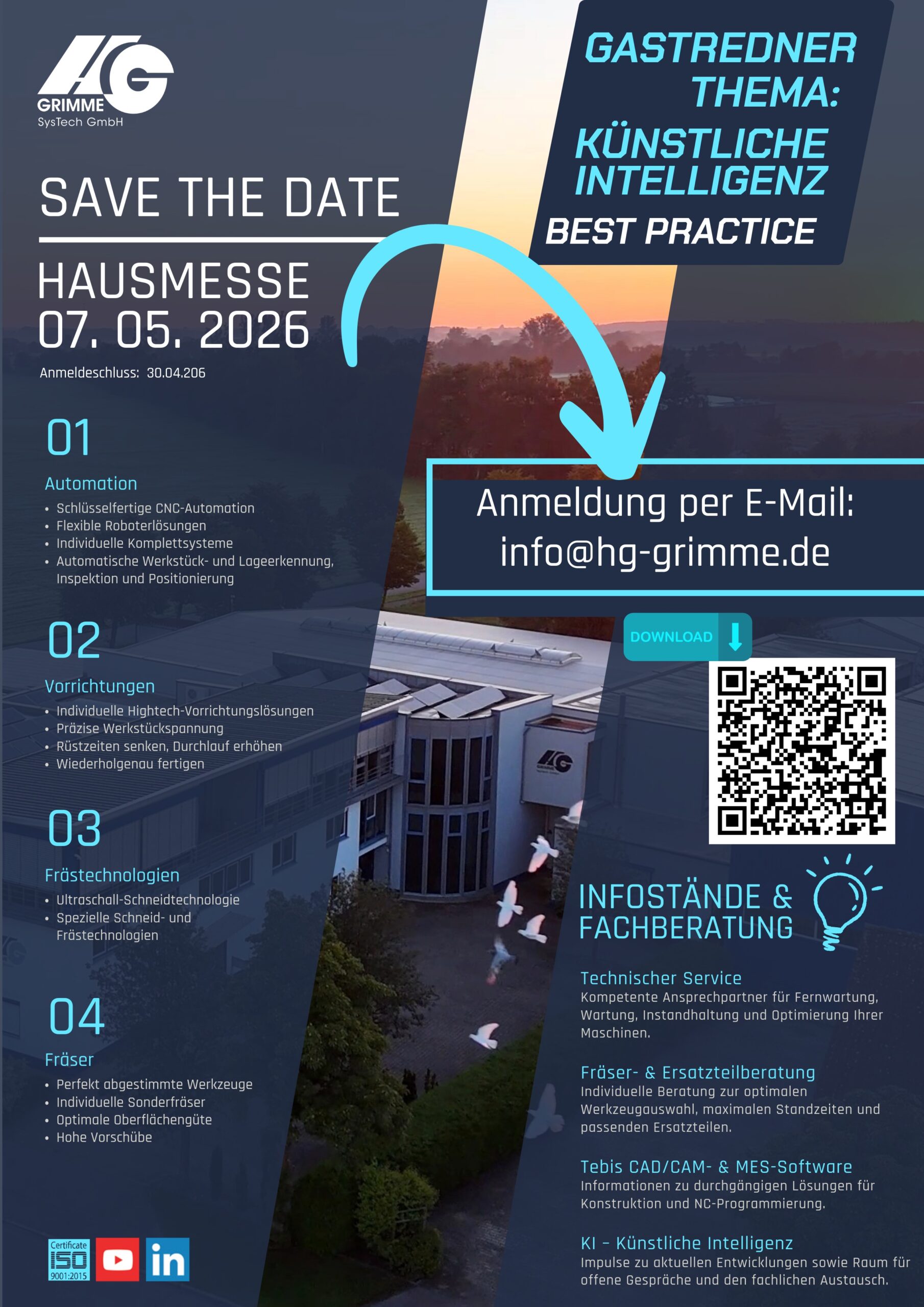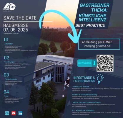 „Wir zeigen Ihnen aktuelle Lösungen rund um CNC-Automation, Vorrichtungstechnik und moderne Frästechnologien. An unseren Infoständen stehen Ihnen unsere Experten für Fragen und den fachlichen Austausch zur Verfügung. Ergänzt wird das Programm durch einen Gastvortrag mit Best-Practice-Beispielen zum Einsatz von Künstlicher Intelligenz.“
